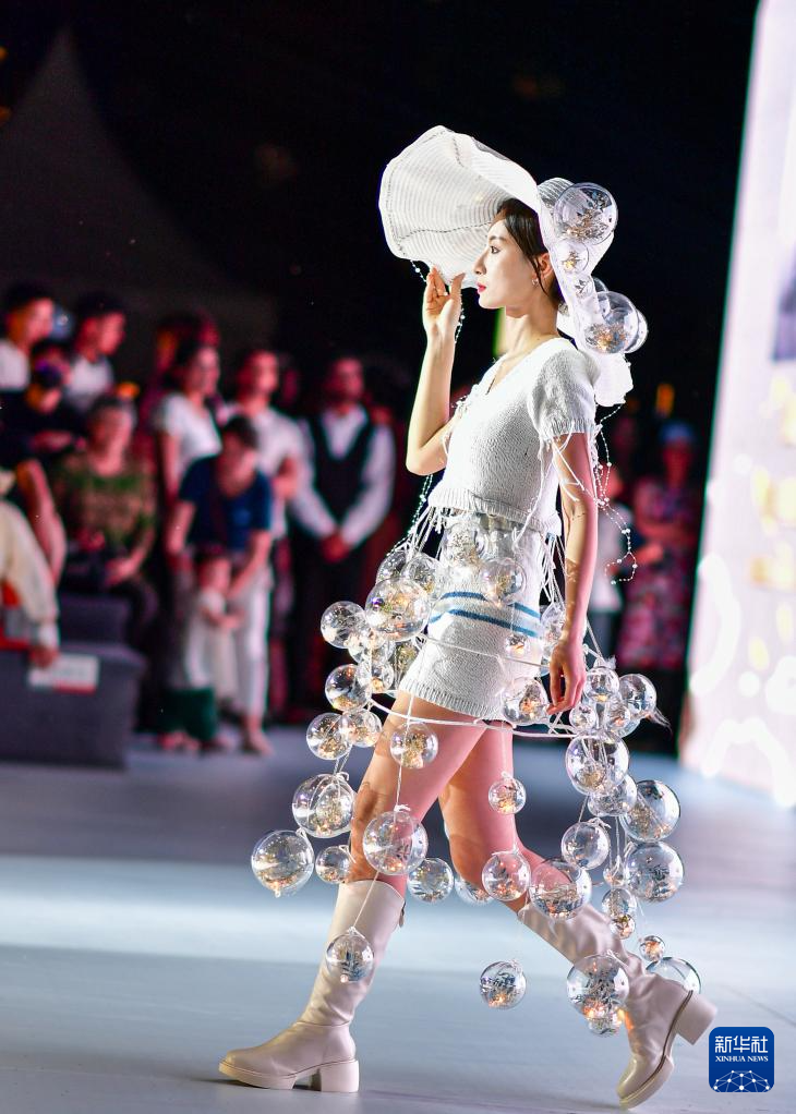 5月24日,校园模特在展示四川大学学生利用科技面料、低碳材料设计的服饰作品。新华社发(陈居伟摄)